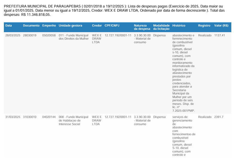 • WEX E DRAW LTDA recebeu R$ 9.215.354,93 da Prefeitura de Parauapebas em 2025, atendendo diversas secretarias, fundos e órgãos municipais, com contratos firmados majoritariamente por dispensa de licitação.