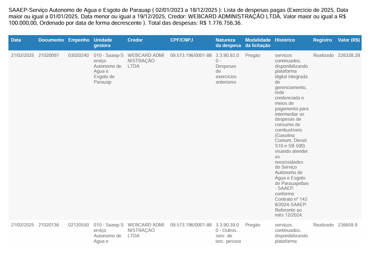 Além disso, a WEBCARD faturou mais R$ 1.776.756,36 junto ao SAAEP (Serviço Autônomo de Água e Esgoto de Parauapebas), igualmente em despesas com combustível, mesmo em um ano marcado por reclamações constantes da população sobre falta d’água e instabilidade no abastecimento.