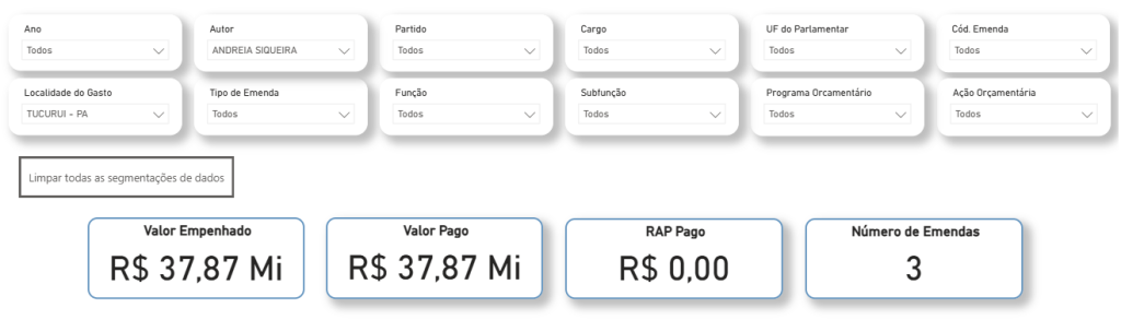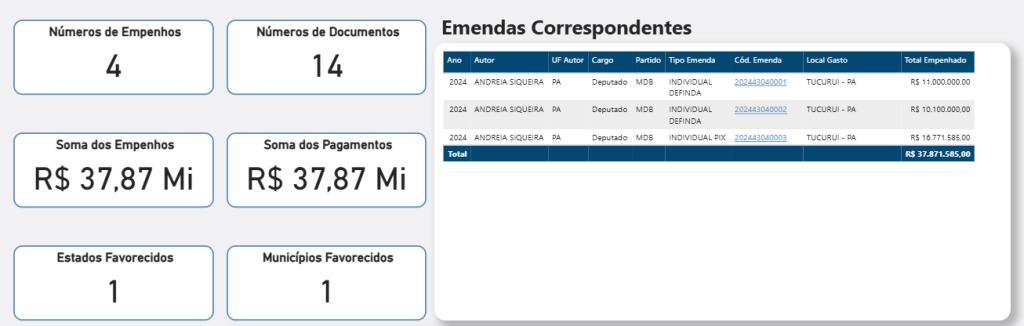 De acordo com os dados das emendas individuais de 2024 e 2025, a parlamentar concentrou uma fatia significativa de seu orçamento em Tucuruí. Somente em três grandes blocos de emendas em 2024, a cidade foi o destino de R$ 37.871.585,00.