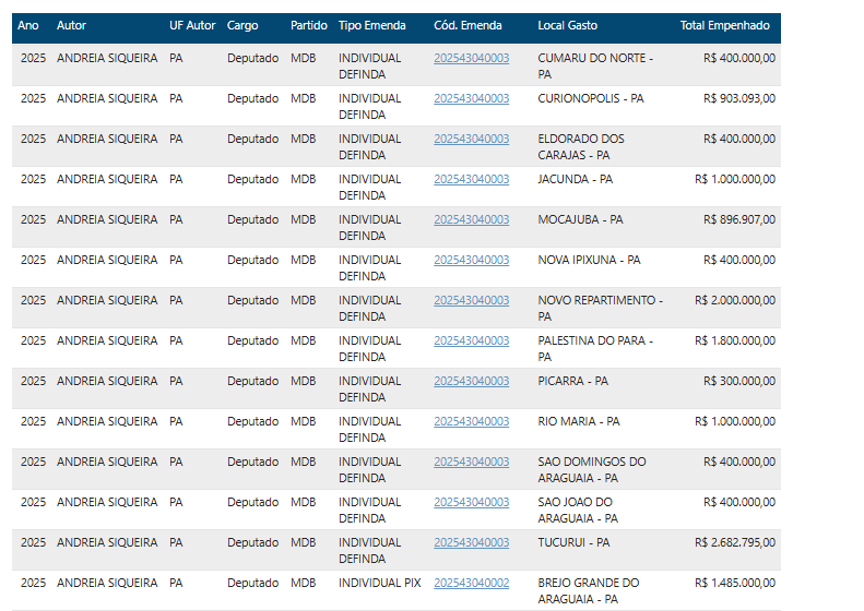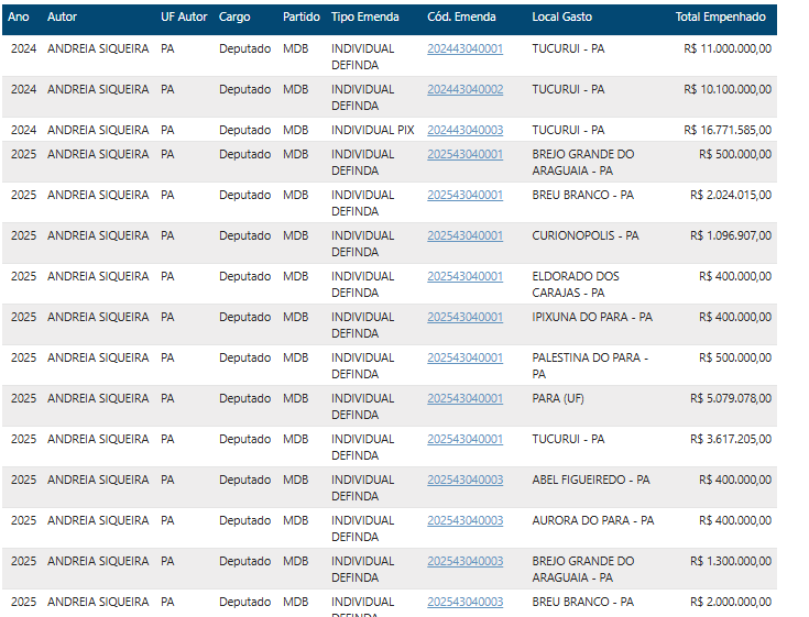 Em um claro exemplo de favoritismo familiar e má gestão pública, a deputada federal Andrea Siqueira (MDB-PA) destinou mais de R$ 37.871.585,00 milhões em emendas parlamentares para Tucuruí, município governado por seu esposo, o prefeito Alexandre Siqueira.