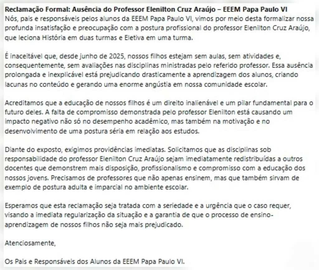 No texto, os pais e responsáveis exigem “providências imediatas”, solicitando que as aulas do professor Elenilton sejam redistribuídas para outros docentes “que demonstrem mais disposição, profissionalismo e compromisso com a educação dos nossos jovens”.