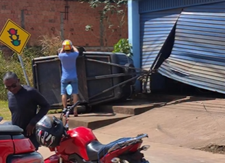 Após a colisão, a carretinha só parou ao bater com força contra o portão de uma loja da região, evidenciando a gravidade da situação.