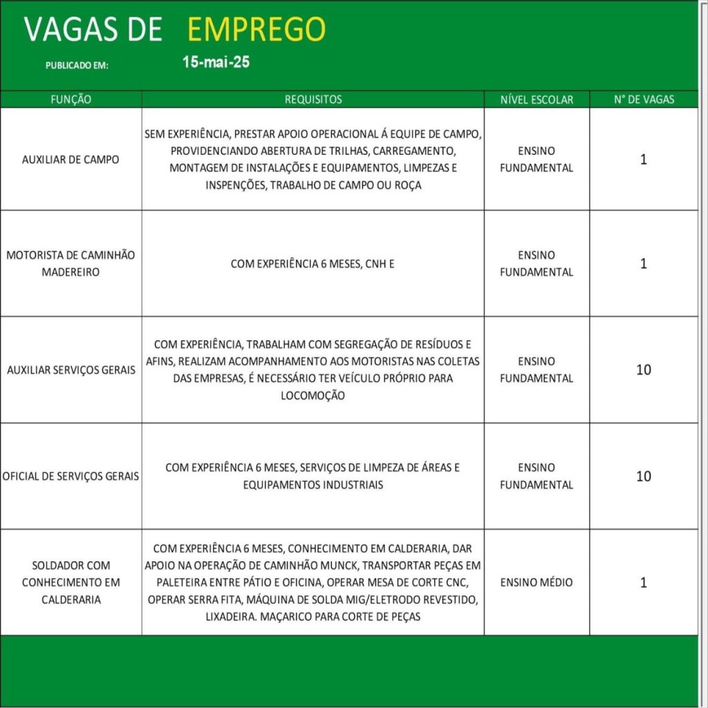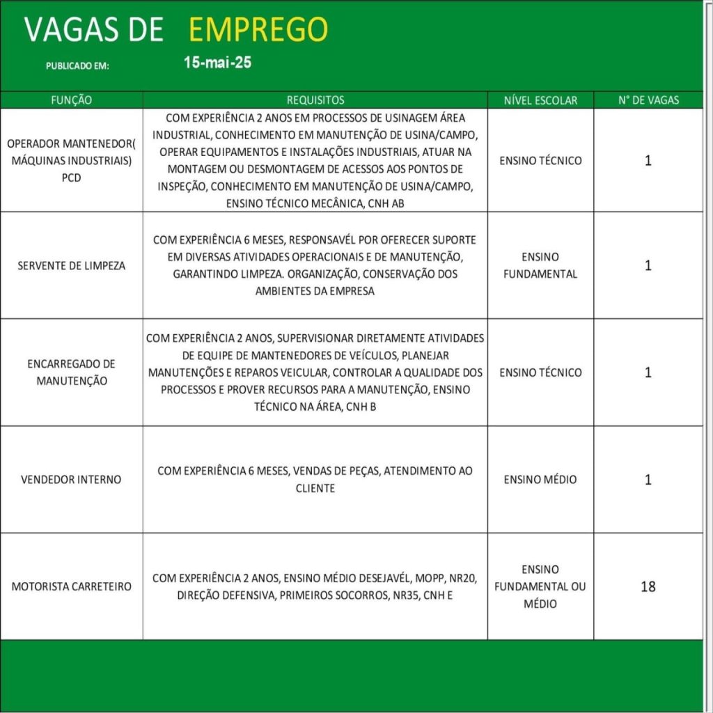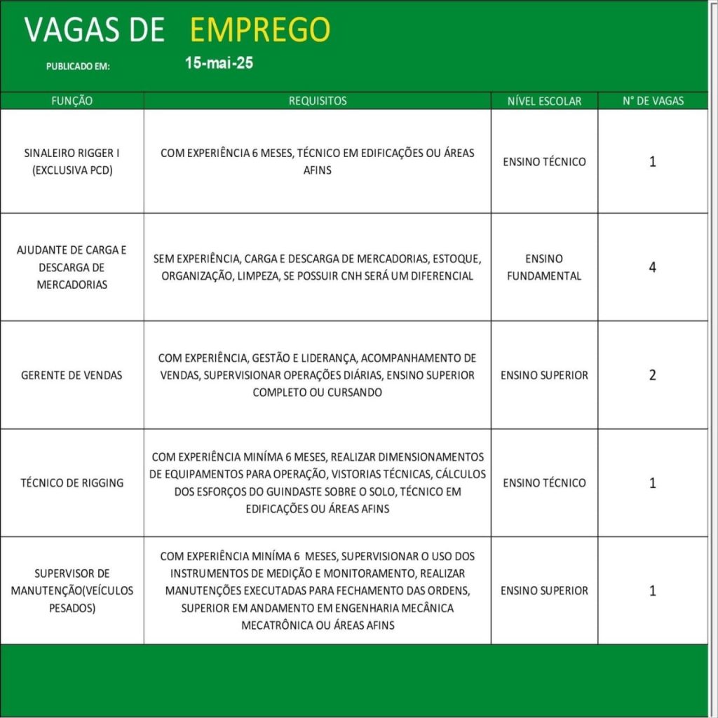 Entre os destaques, há 18 vagas para motoristas carreteiros, 12 para serventes de obras, 10 para auxiliar e oficial de serviços gerais, além de oportunidades exclusivas para pessoas com deficiência (PCD), como operador de máquinas industriais e sinaleiro rigger.