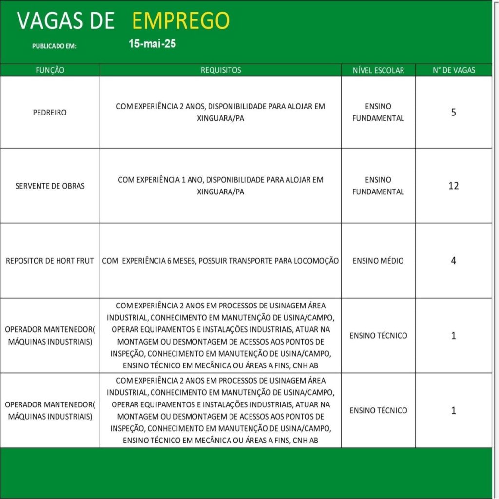 O Sistema Nacional de Emprego (Sine) de Parauapebas atualizou seu painel de oportunidades nesta quinta-feira (15), oferecendo 91 vagas de emprego em diversas áreas e níveis de escolaridade. As chances vão desde funções operacionais até cargos técnicos e de supervisão.