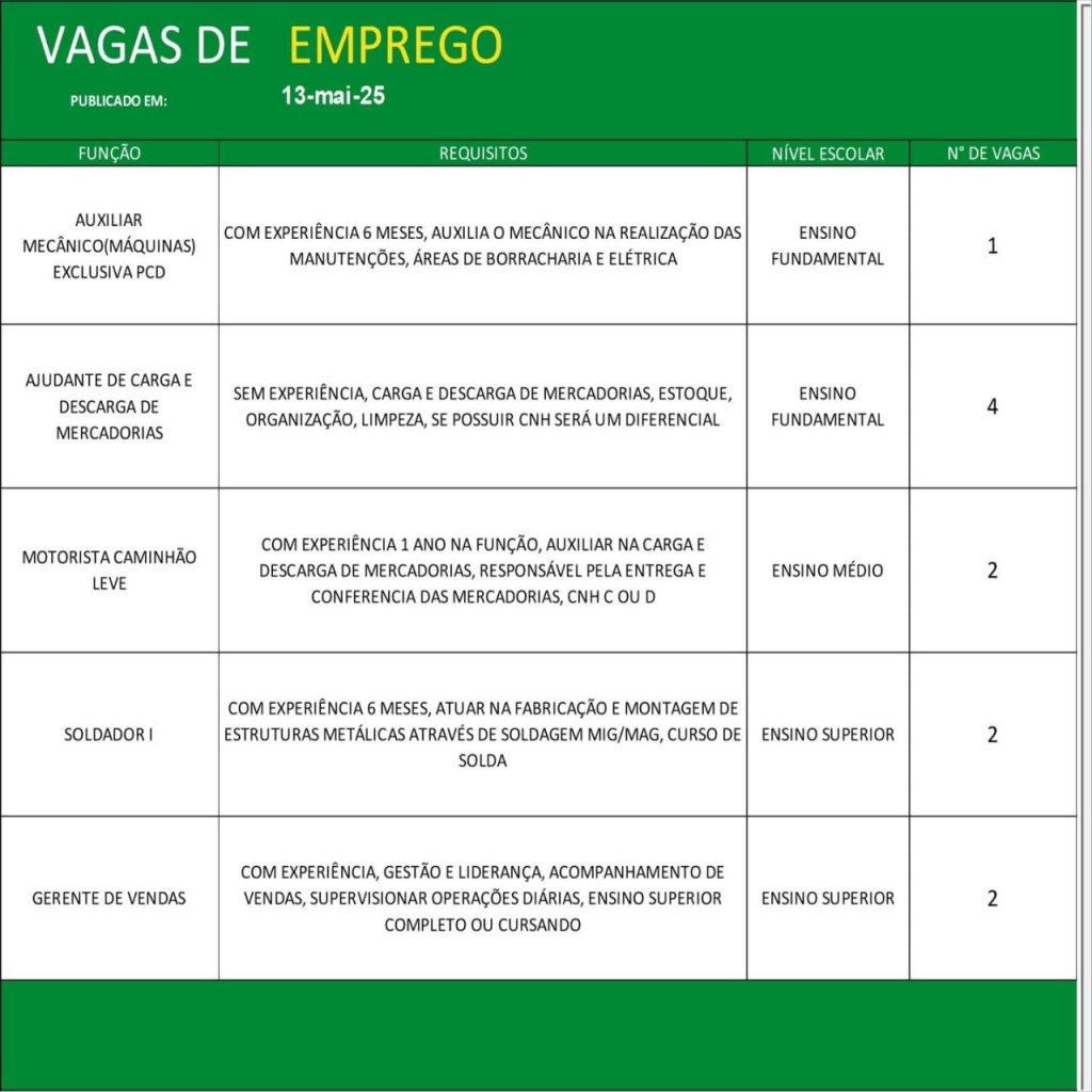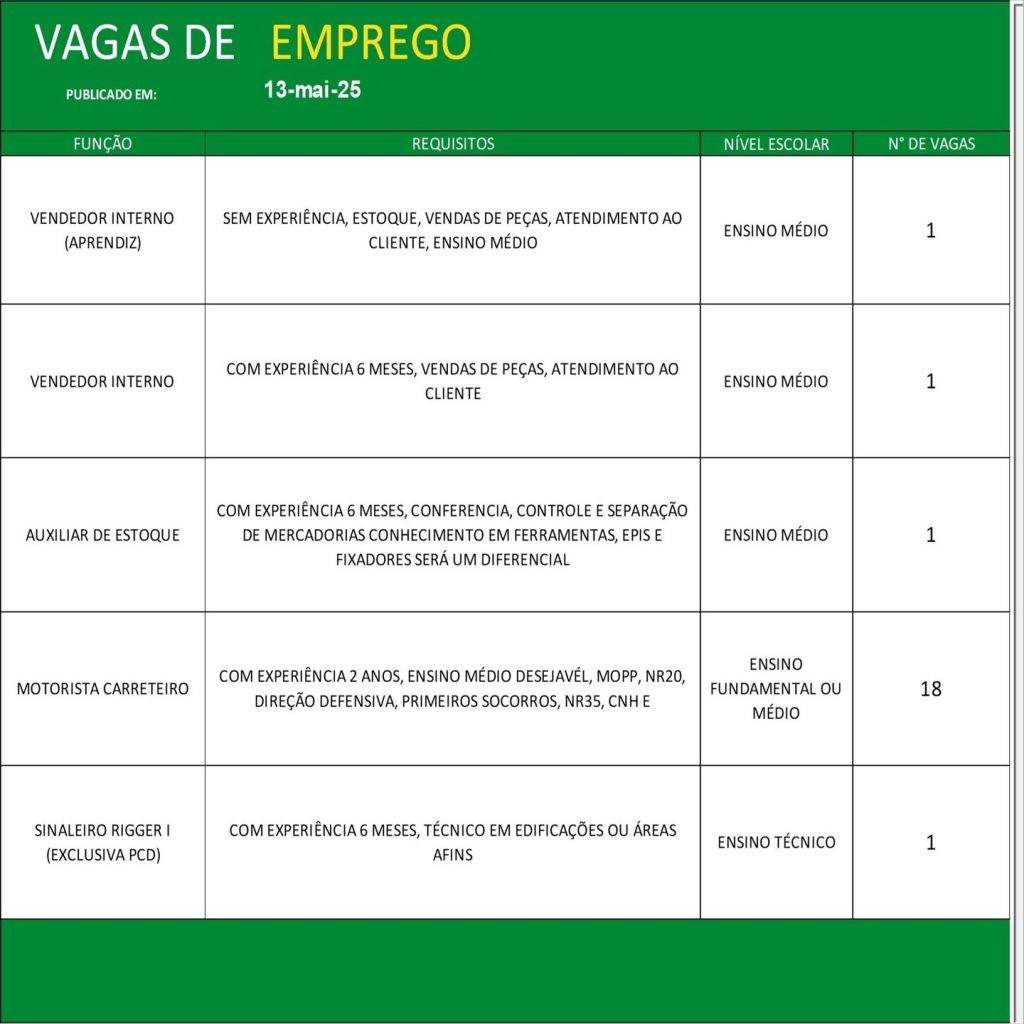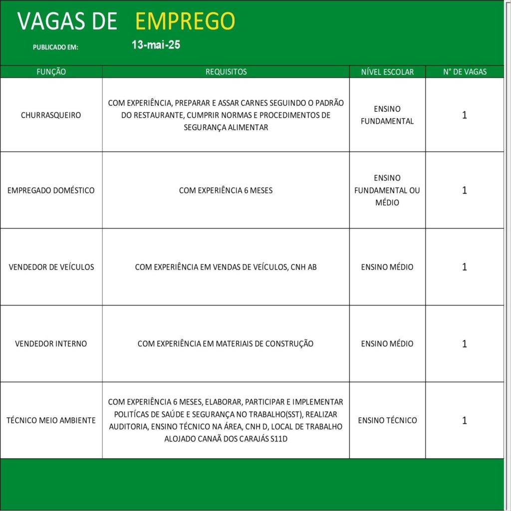 Acompanhe diariamente as atualizações do painel de vagas e não perca as oportunidades de conquistar uma colocação no mercado de trabalho formal. Para mais detalhes e informações sobre o processo seletivo, consulte o SINE ou o órgão de emprego responsável em sua cidade.