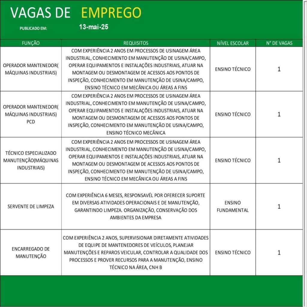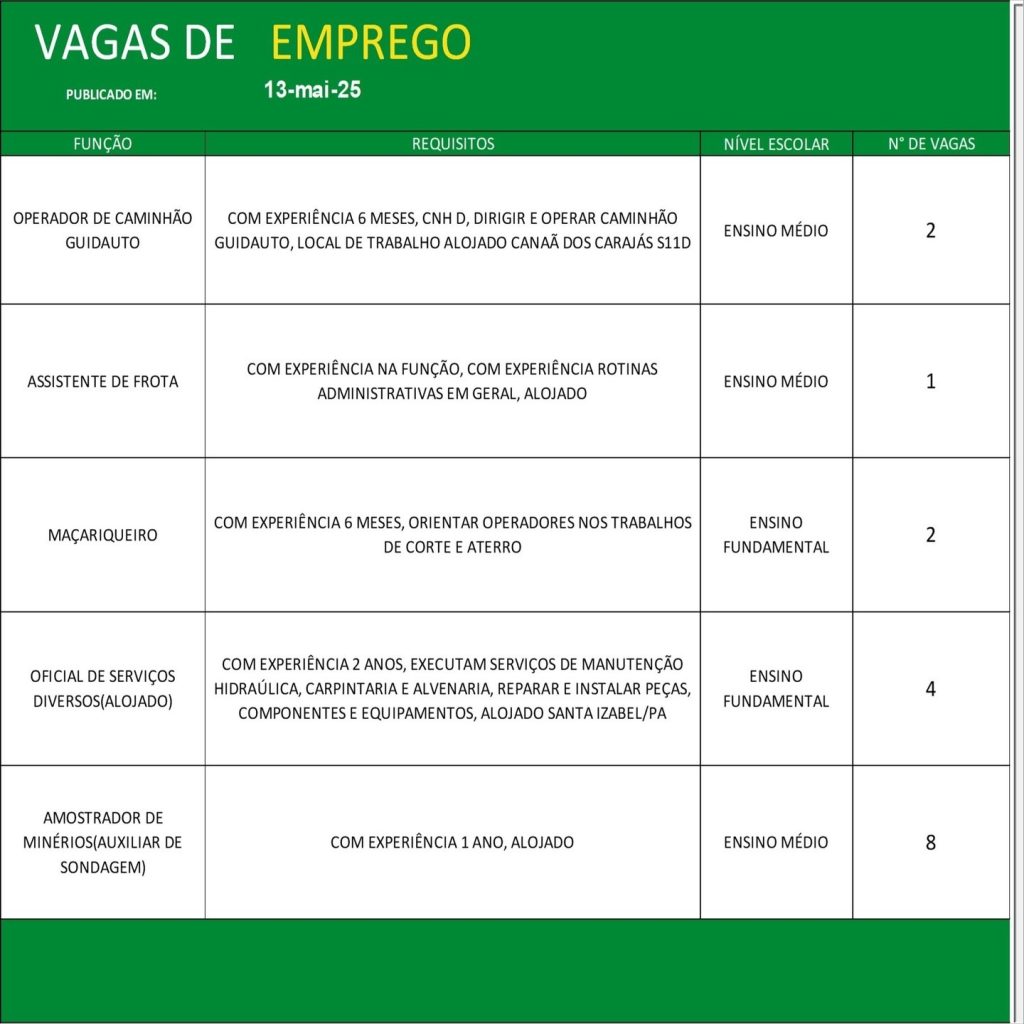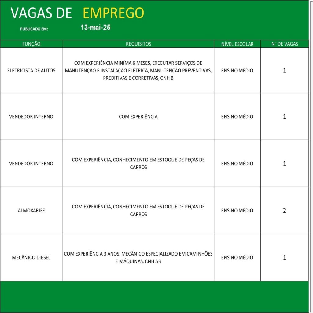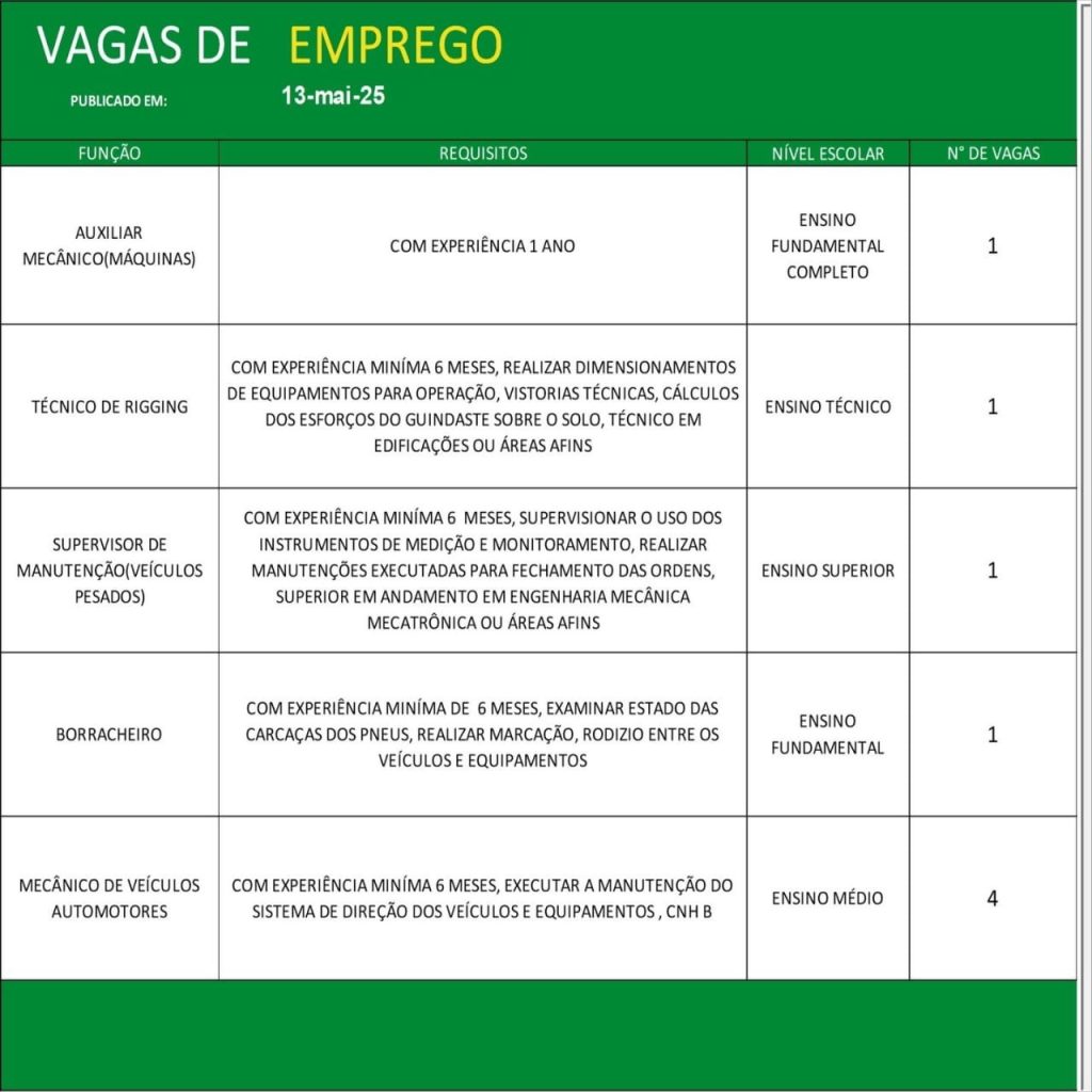 Acompanhe diariamente as atualizações do painel de vagas e não perca as oportunidades de conquistar uma colocação no mercado de trabalho formal. Para mais detalhes e informações sobre o processo seletivo, consulte o SINE ou o órgão de emprego responsável em sua cidade.