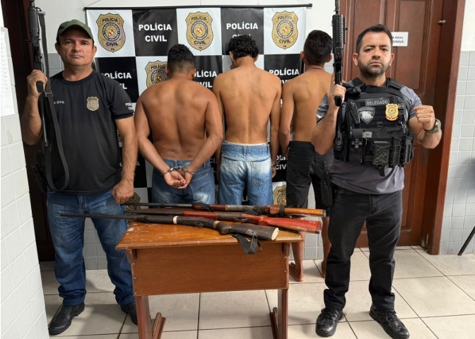 Com os suspeitos, foram apreendidas três carabinas, sendo duas de calibre 20 e uma de calibre 36. Diante do flagrante, os policiais deram voz de prisão imediata e conduziram os detidos à delegacia para os procedimentos legais cabíveis.